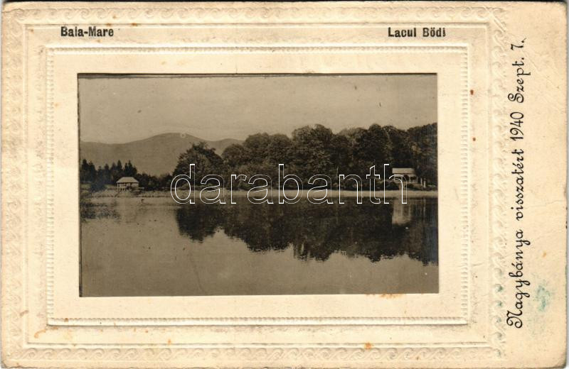 1940 Nagybánya, Baia Mare; Lacul Bödi. Libraria si Tipografia Aladar Frankovits / Bódi tó, szecessziós keretben / lake. photo + "1940 NAGYBÁNYA VISSZATÉRT" So. Stpl (gyűrődések / creases)