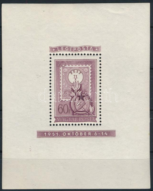 https://www.darabanth.com/en/513-Auction-philately-postcards-numismatics-artwork-books-collectibles-jewelry/513.0/Selected-Hungarian-items-and-collections/Single-hungarian-issues-at-a-very-low-starting-price~1/1951-80-eves-a-magyar-belyeg-Lila-blokk-550000-apro-gumihiba-a-kereten-tiny-gum-disturbance~II3467559