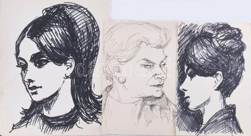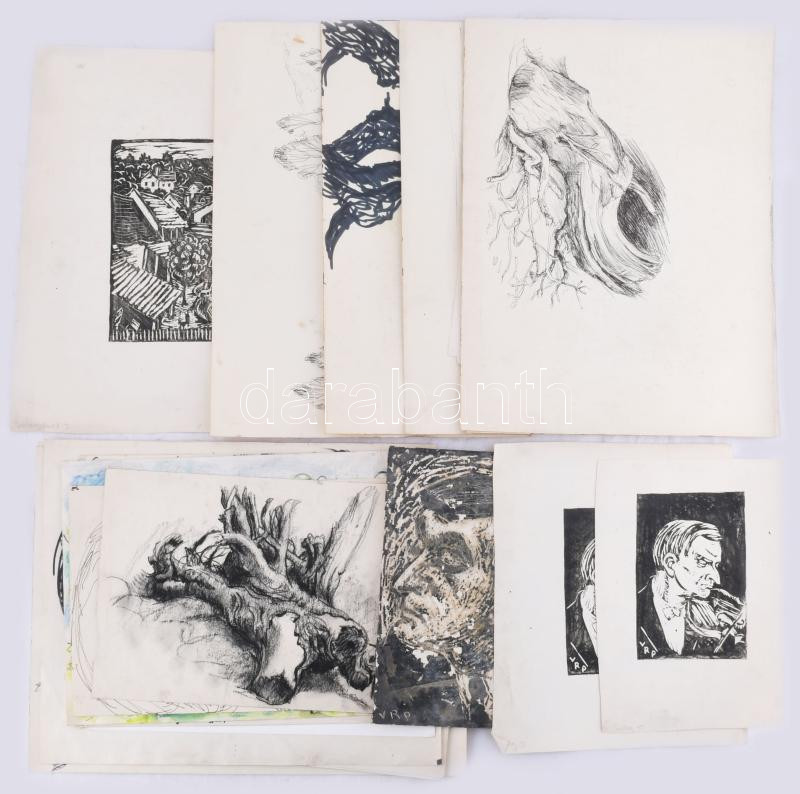 Olvashatatlan jelzéssel vagy jelzés nélkül: 30 db rajz és sokszorosított grafika, közte néhány kevés Dunakanyar. Klf. technikák, papír, klf, méretekben. Részben sérült.