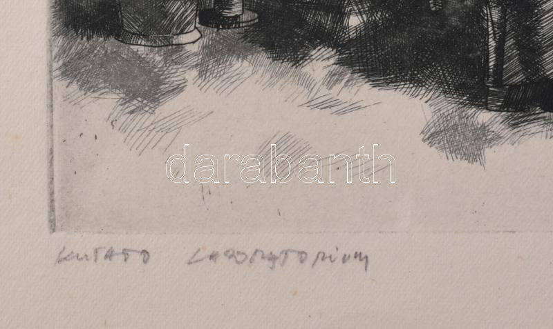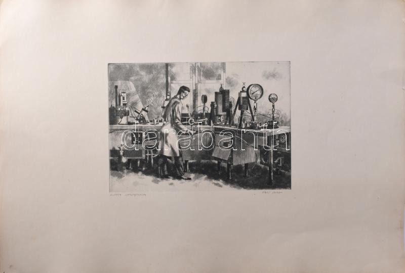 Gacs Gábor (1930-2019): Kutató laboratórium. Rézkarc, papír. Jelzett. ...