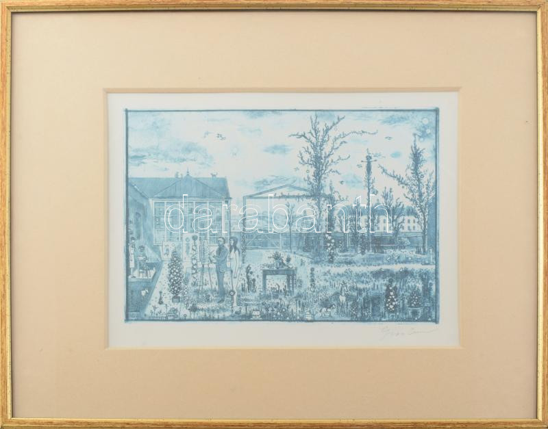 Gross Arnold (1929-2015): A művészet kertje. Ofszet nyomat, papír, jelzett a nyomaton, üvegezett fakeretben, 17x24 cm