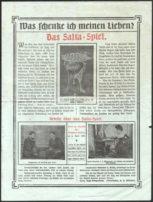 Description: 1900 Salta játék ( kétjátékos absztrakt stratégiai társasjáték, amelyet Konrad Heinrich Büttgenbach talált fel 1899-ben ) népszerűsítő képes nyomtatvány. / 1900 Salta game (a two-player abstract strategy board game invented by Konrad Heinrich Büttgenbach in 1899) promotional illustrated print.