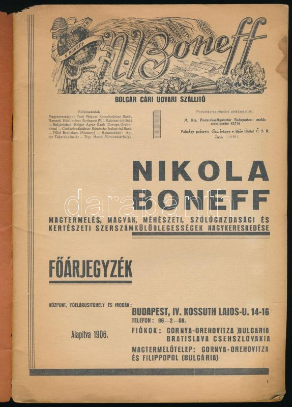 1935 Nikola Boneff bolgár cári udvari szállÃtó, magtermelés, magvak, méhészeti, szÅ‘lÅ‘gazdasági és kertészeti szerszámkülönlegességek nagykereskedése képes árjegyzék, tűzött papÃrkötés, kisebb sérülésekkel, 64 p.