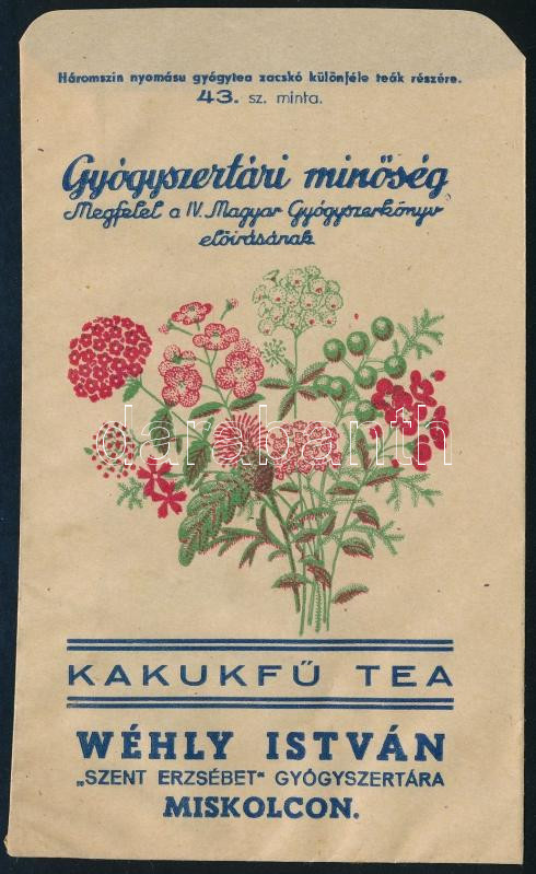 Wéhly István "Szent Erzsébet" Gyógyszertára Miskolc kakukkfű tea gyógyszertári boríték