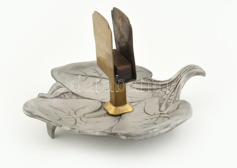 Antik gyufatartós hamuzó. Asztali tömör öntöttvas levél formájú hamuzó, réz szecessziós Gyufásdoboztartóval , Jelzett:"H Törv.védve és formaszám. Szép.korának megfelelő állapotban. 19x11 cm