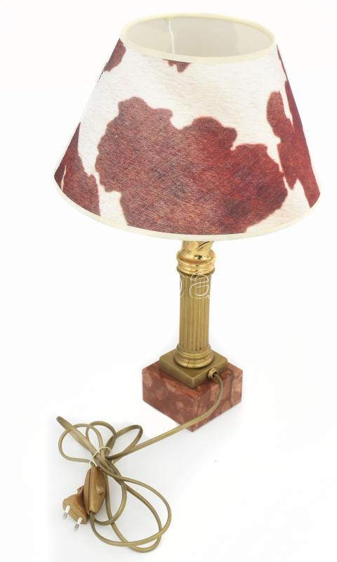 Bronz állatfej mintás asztali lámpa, márvány talapzaton, állatbőr mintás ernyővel, m: 48 cm