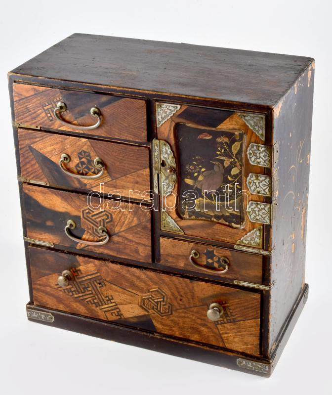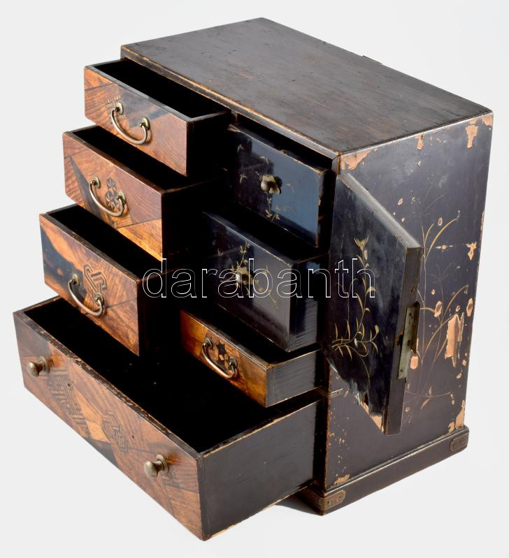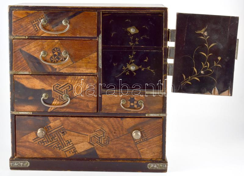 Ékszerszerkrény. Antik keleti, buddhista motívumokkal, közötte svastik...