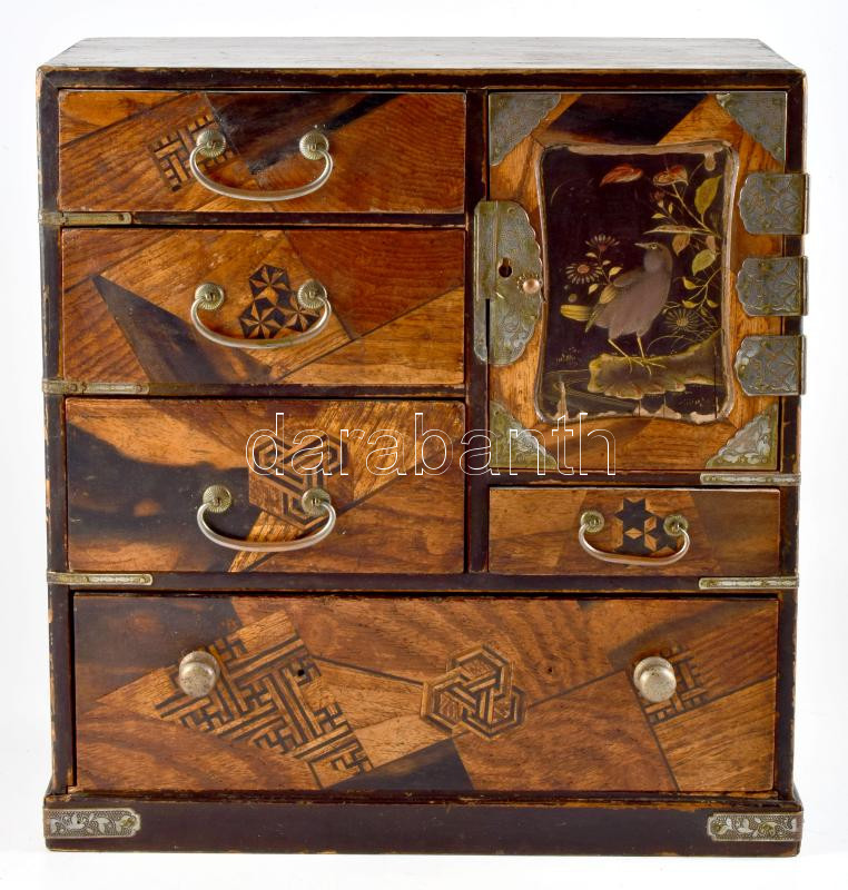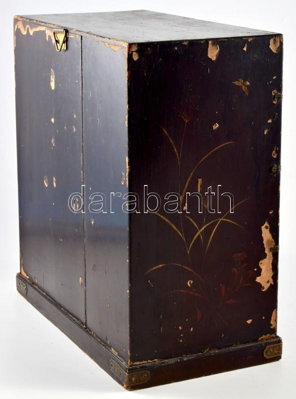 Ékszerszerkrény. Antik keleti, buddhista motívumokkal, közötte svastikával díszített. Lakkozott fa, réz. Sérülésekkel . 29x27 cm