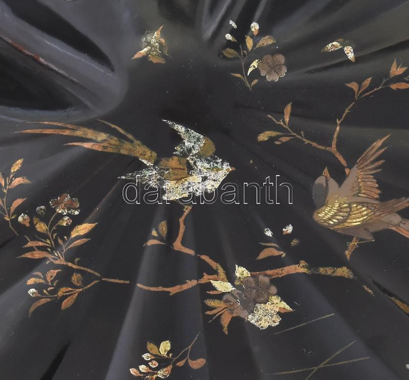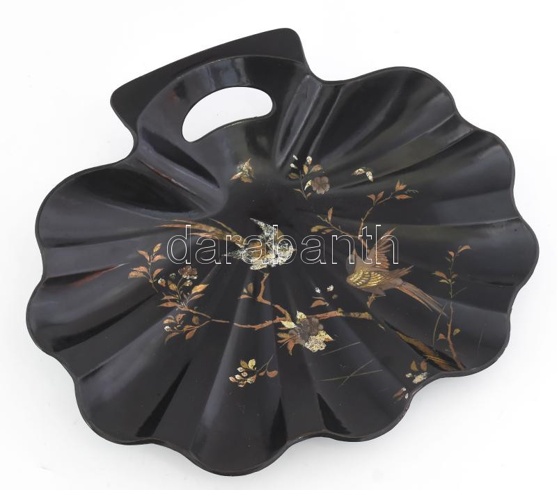Japán kagyló alakú lakkozott kínáló, festett madármintával, kopással, ...