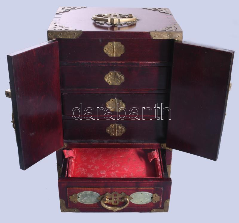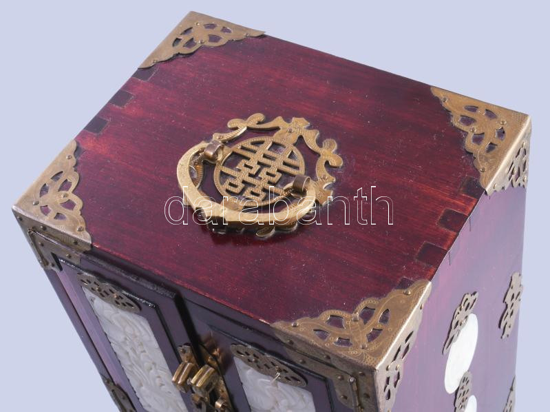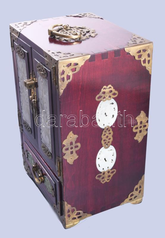 Kínai lakkozott fa ékszeres szekrény, faragott kő berakásokkal, réz veretekkel, 28x19x15 cm