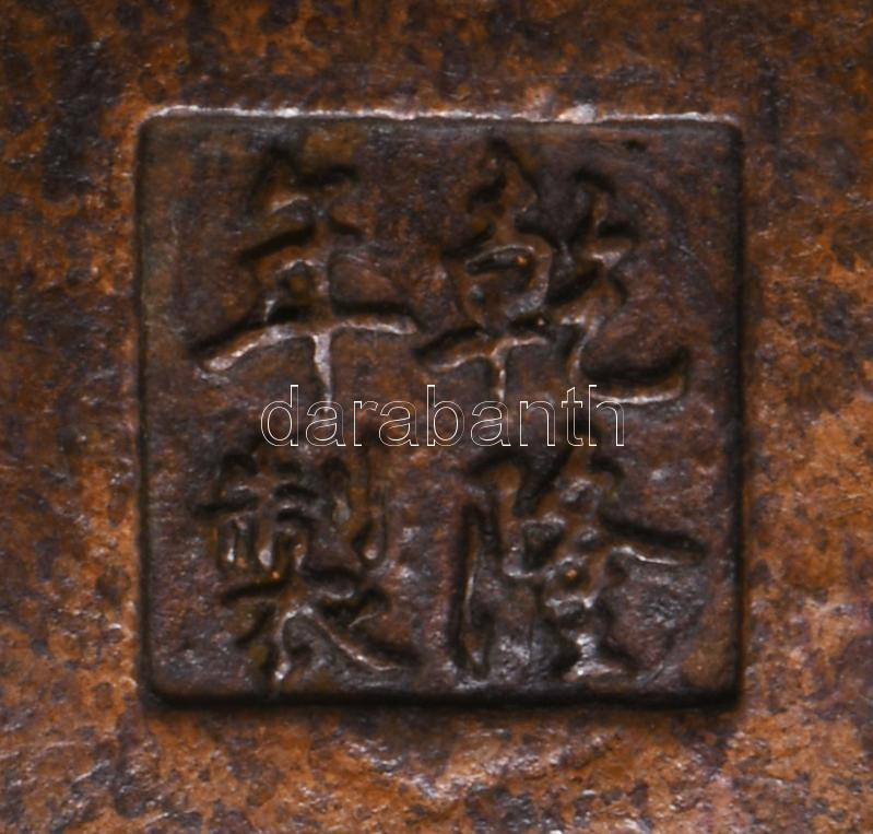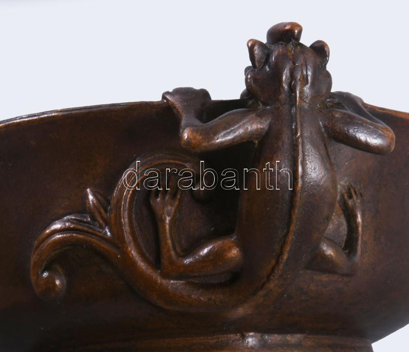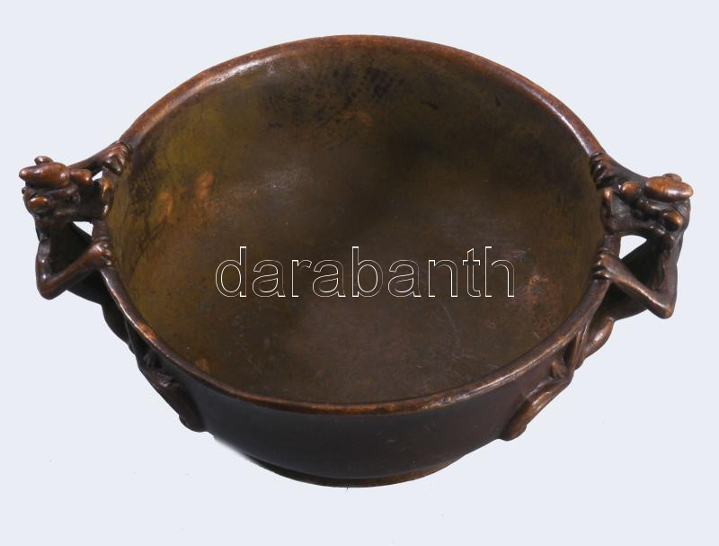 Kínai réz / bronz tálka, sárkány figurális fülekkel, jelzett, 11x8,5 c...