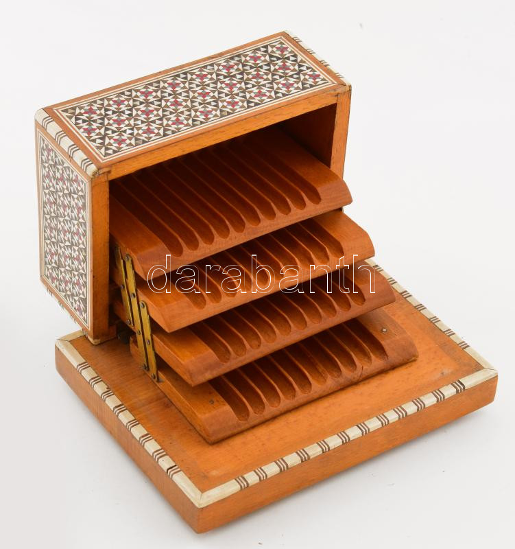 Marokkói csont- és gyöngyház berakásos négyszintes cigarettakínáló, 14...