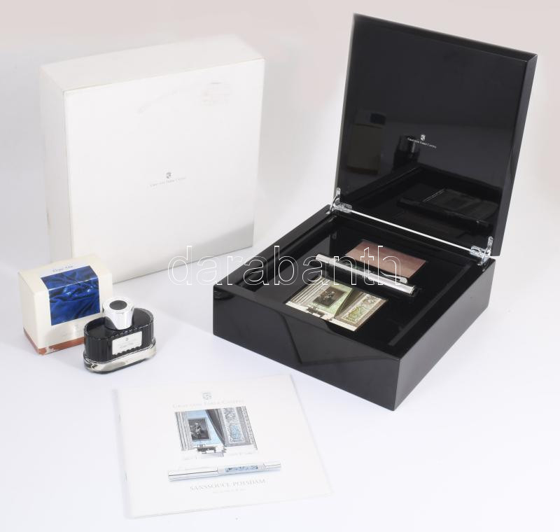 Sanssouci Potsdam- Pen of the Year 2015 by Faber-Castell. Limited edition exclusive fountain pen set, complete in a lacquered wooden gift box, with instructions, in its original box, with original Royal Blue ink. Scratch-free, in good condition.