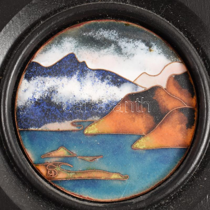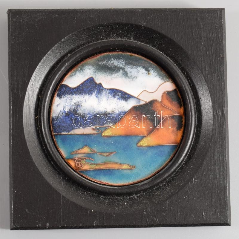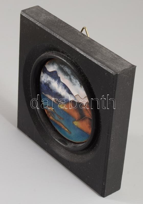 Sigrid Hoivik rekeszzománc tájkép, jelzett, fa keretben, d: 6 cm