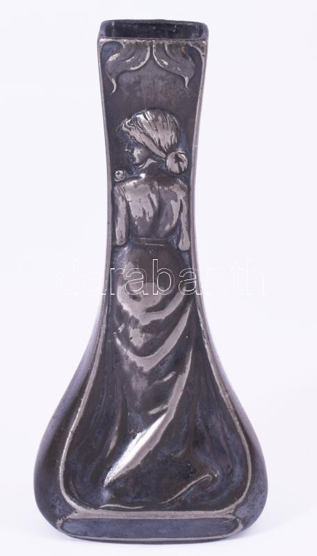 Szecessziós ón váza nőalakkal, m: 14 cm