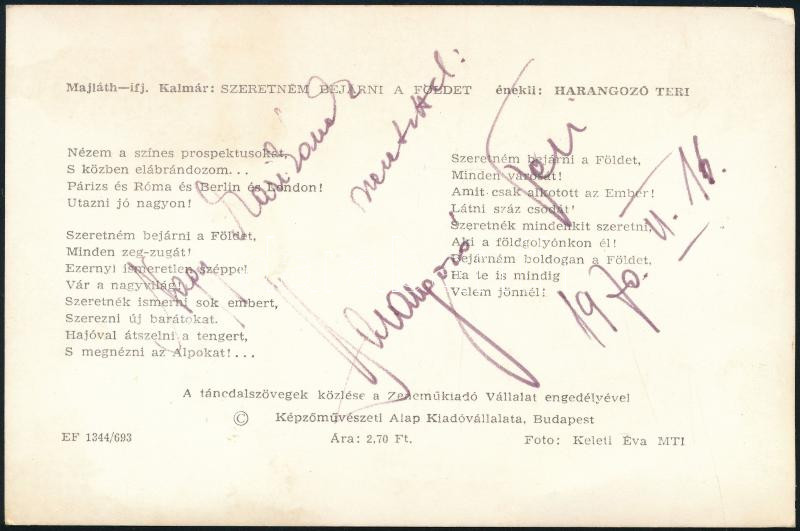 1970 Harangozó Teri (1943-2015) énekesnő saját kezű dedikációja őt ábr...