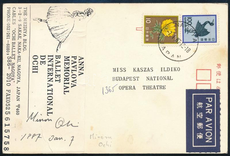 1987 Minoru Ochi japán balett-táncos autográf dedikációja képeslapon, Kaszás Ildikó (1941-2024) balett-táncos, koreográfus részére címezve és küldve