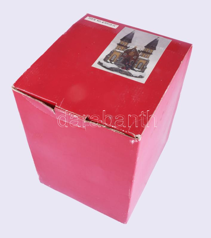 Elemmel működő világító és zenélő karácsonyi templom asztaldísz, használatlan, eredeti dobozában, m: 26 cm