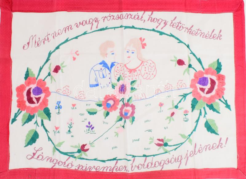 Kézzel hímzett konyhai falvédő, "Mért nem vagy rózsaszál, hogy letörhetnélek, Lángoló szivemhez, boldogság jelének!" felirattal, 48x76 cm