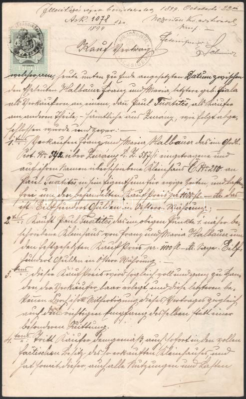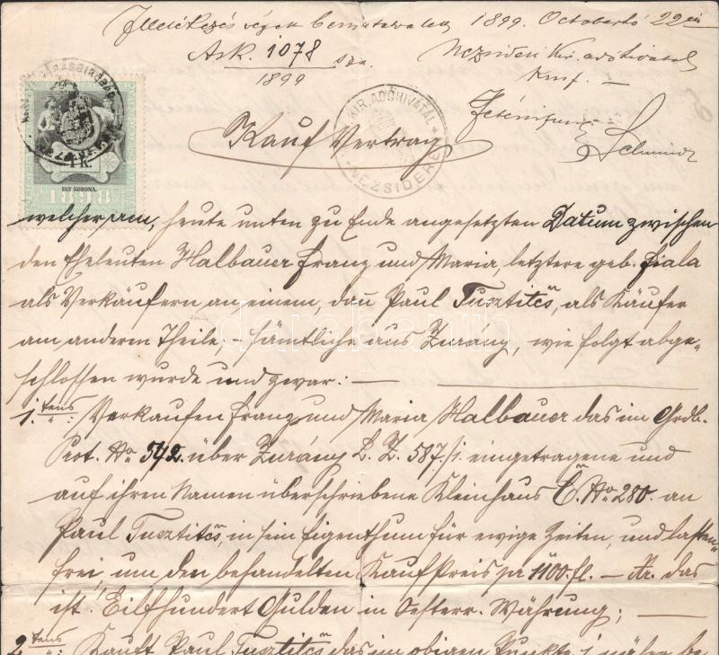 1899 Zurány, ( Zurndorf, Burgenland, A) adásvételi szerződés házra, 1K illetékbélyeggel Tustitcs Pár javára / Contract for house