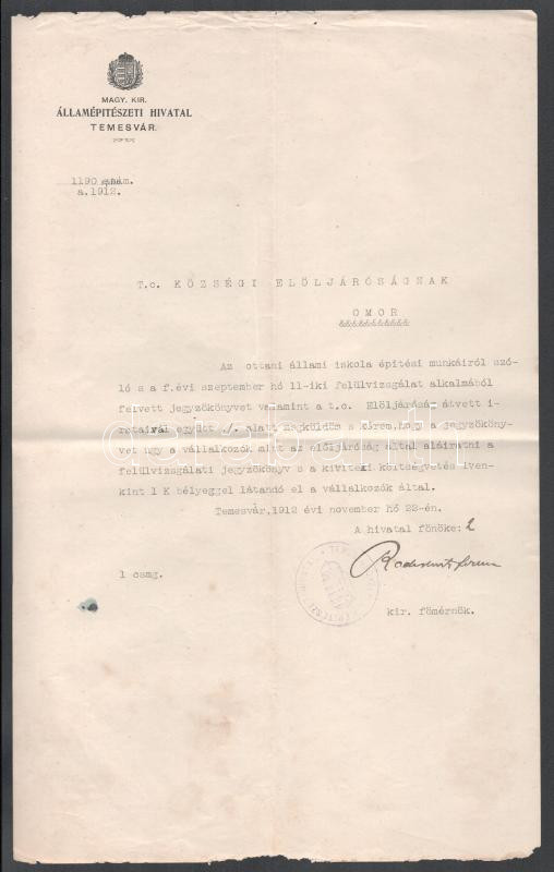 1912 Temesvár, M. Kir. Államépítészeti Hivatal hivatalos levele és az ...