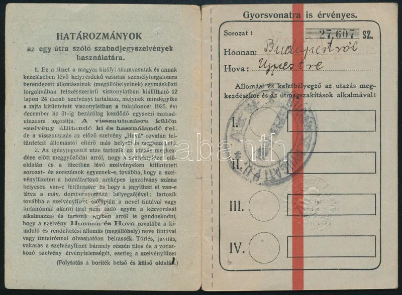 1925 Magyar Királyi Államvasutak (MÁV) Szabadjegyek tényleges vasúti a...