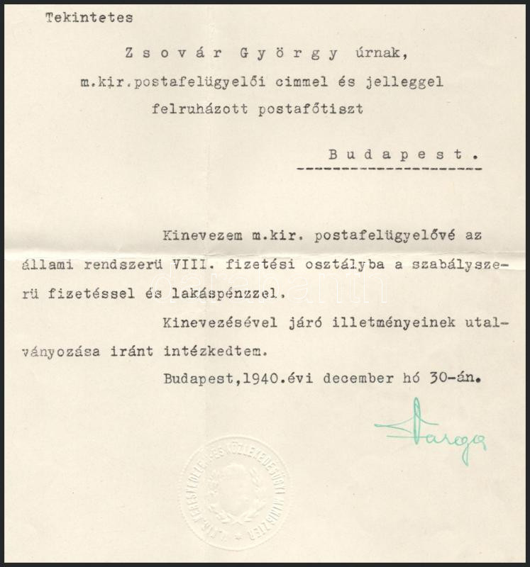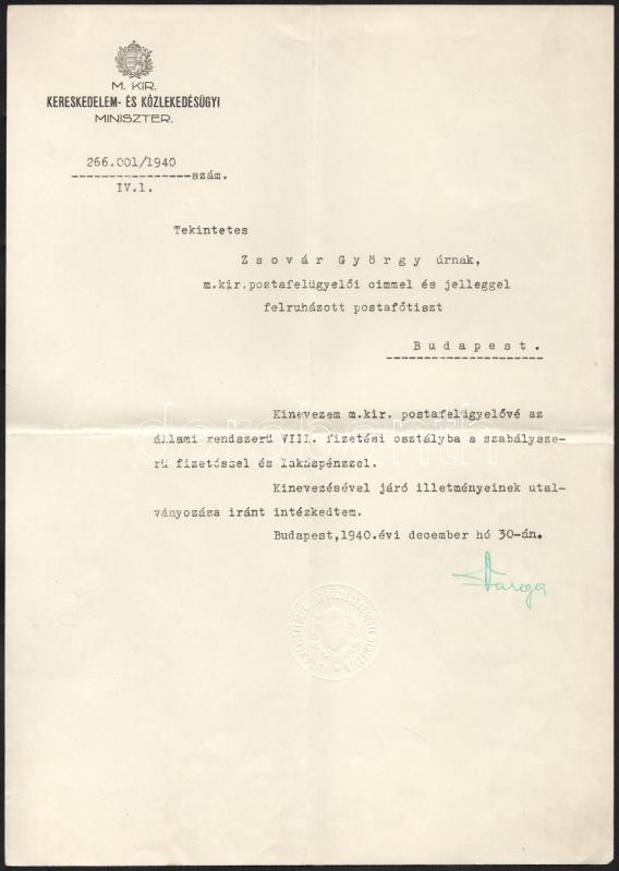 Description: 1940 Varga József (1891-1956) kereskedelem- és közlekedésügyi, Corvin-koszorúval (1942) és Kossuth-díjjal (1950,1952) kitüntetett miniszter autográf aláírása gépelt kinevezési levélen, fejléces papíron, szárazbélyegzővel, hajtott