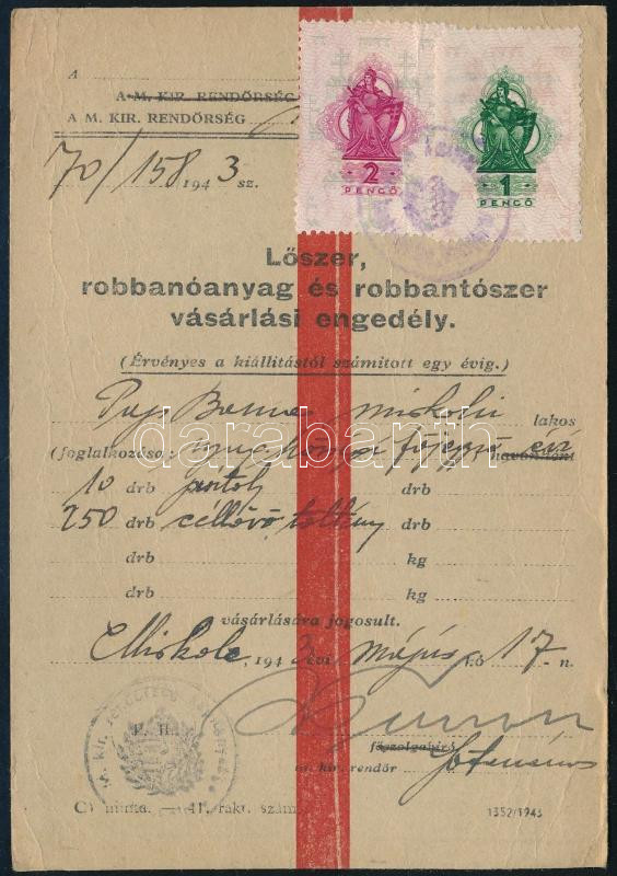 1943 Miskolc, lőszer, robbanóanyag és robbantószer vásárlási engedély, 2P + 1P okmánybélyeggel