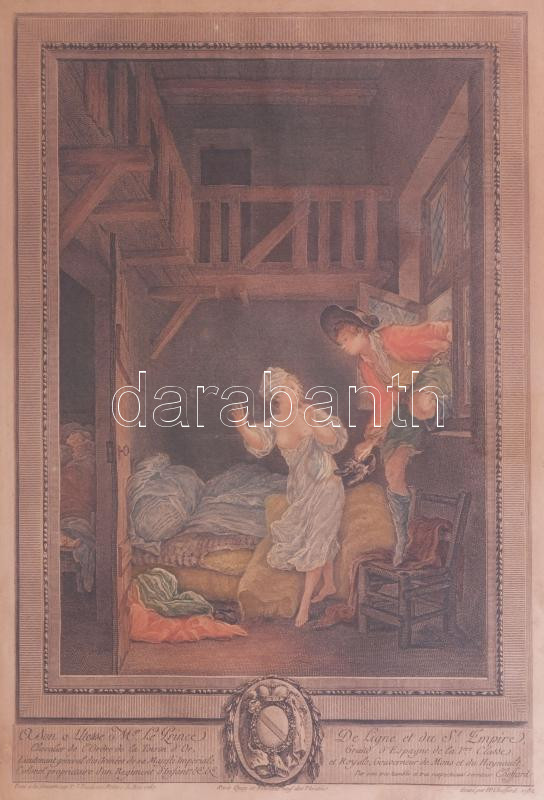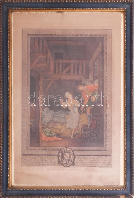1782 Pierre-Antoine Baudouin (1723-1769) után Pierre-Philippe Choffard (1730-1809) metszése: Marchez tout doux, parlez tout bas (erotikus jelenet). SzÃnezett rézmetszet, papÃr, kissé sérült, üvegezett fakeretben, 40x28,5 cm, keret: 55x39,5 cm