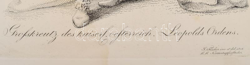 Description: [A Lipót rend nagykeresztje] Grosskreutz der kaiser. oesterreich. Leopolds Orden. Wien, 1808. T. Fischer. Nagy méretű rézmetszet, selyem előzéklappal. 27,5x39,5 cm / Copper plate engraving.