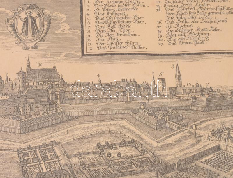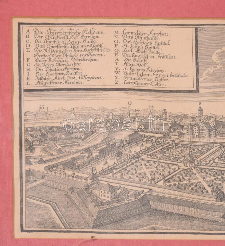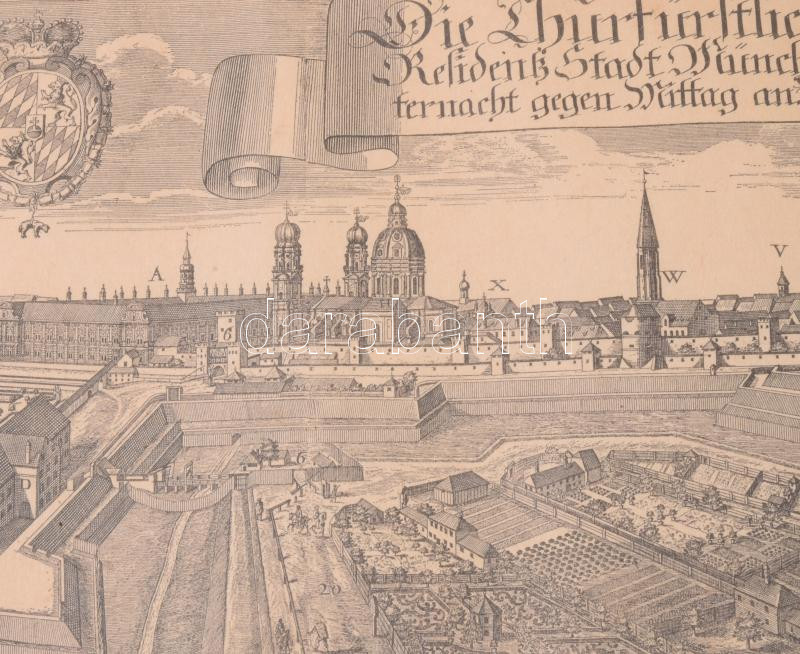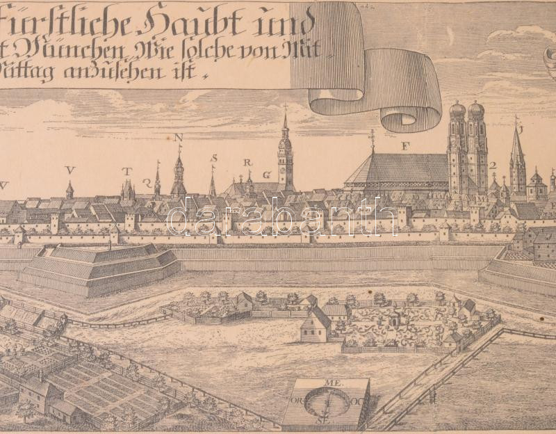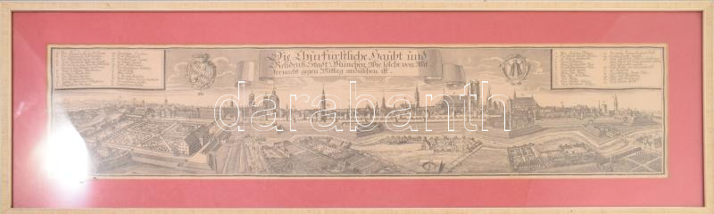 XX. század "Die Churfürstliche Haubt und Residenz Stadt München, Wie solche von Mitternacht gegen Mittag anzusehen ist", Münchent ábrázoló régi metszet modern reprodukciója, rotációs fametszet, paszpartuban, üvegezett fakeretben, 15,5x63,5 cm, keret: 24x72 cm.