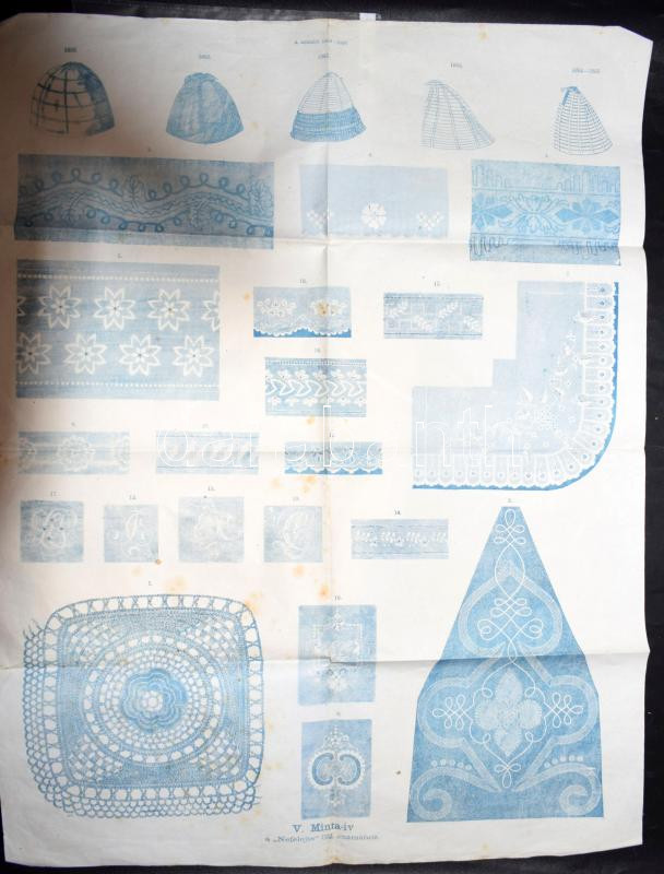 cca 1860 4 db régi ruhadísz, sújtás, magyar otthonka litografált terve...
