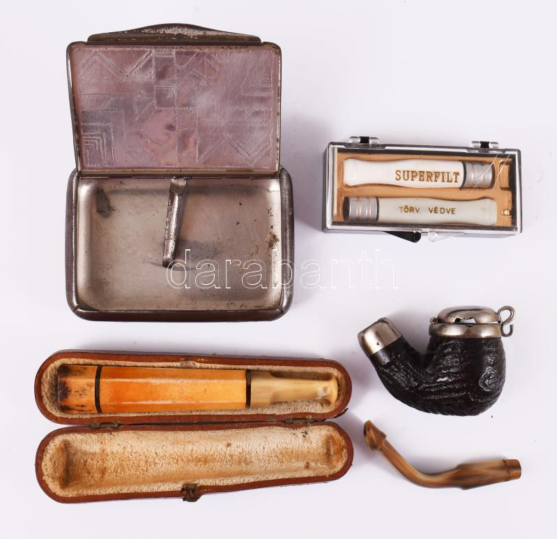Vegyes dohányos tétel: Konstruktivista mintával díszített cigarettás doboz, szipka készlet, leírással, tartalék gumikkal, tajték szipka, gyökérpipa