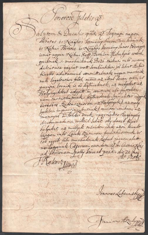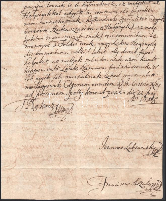 1708 Ipolykövesd, letter from Prince Ferenc II Rákóczi regarding the use of pastures in the Bező (Bezovce, SK) area for the cattle of Count Mihály Bethlen, with the autograph signature of Ferenc Rákóczi, as well as the signatures of Senator János Labsánszky and Rákóczi's secretary Ferenc Aszalay (1674-1729).