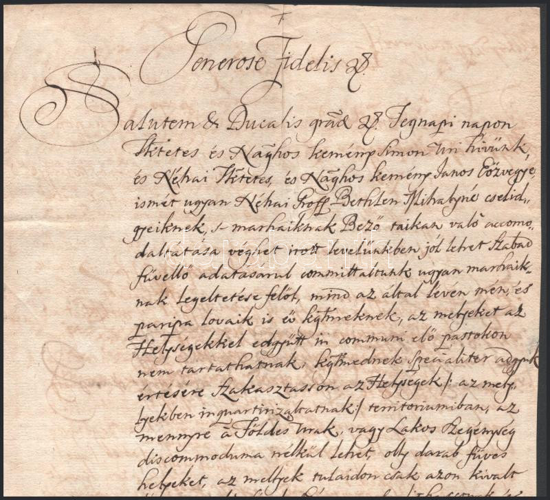 1708 Ipolykövesd, II. Rákóczi Ferenc fejedelem levele Bező (Bezovce, SK) helyiségben található legelők használatáról gróf Bethlen Mihályné marhái számára, Rákóczi Ferenc autográf aláírásával, valamint Labsánszky János szenátor, és Rákóczi titkára Aszalay Ferenc (1674-1729) aláírásával.
