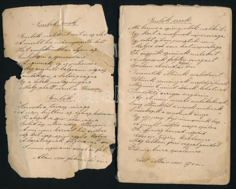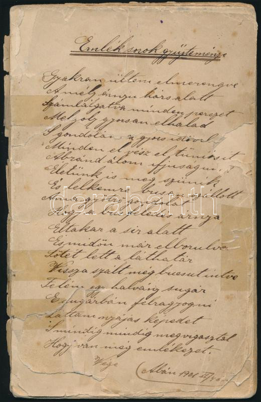 1901 Aba, ,,Emléksorok gyűjteménye", kézzel írt feljegyzések 48 oldalon, borító nélkül, részben sérült, foltos lapokkal