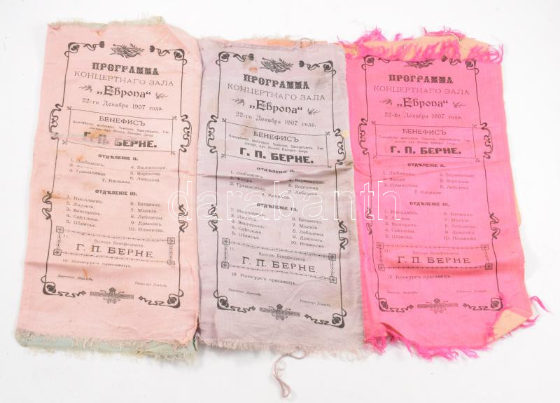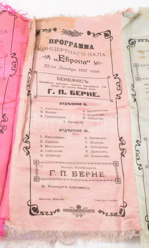 1907 Orosz színházi előadás, az Európa koncert terem programja hat színű selyemre nyomva, két íven. 47x35 cm 1907 Russian theater performance, concert hall program printed on 6-color silk, on two sheets. 47x35 cm