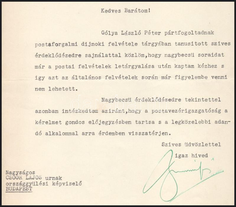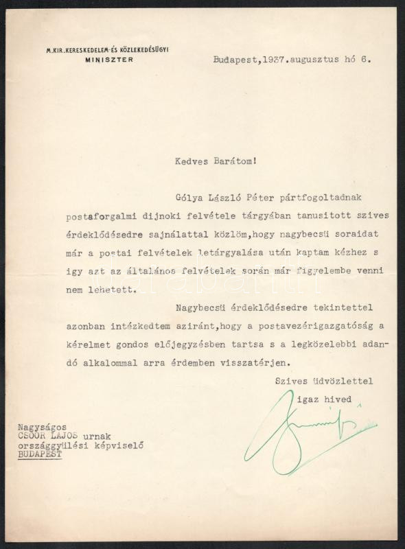 1937 Bp., Bornemisza Géza (1895-1983) országgyűlési képviselő, kereskedelem- és közlekedésügyi miniszter autográf aláírása gépelt levelén Csoór Lajos (1893-1963) országgyűlési képviselő részére