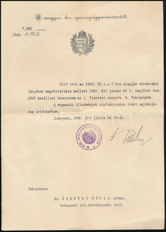 Description: 1940 Bp., Radocsay László (1878-1968) jogász, politikus, főispán, igazságügy-miniszter (1939-1944) autográf aláírása Zsentkó Gyula budapesti kir. törvényszéki bíró részére szóló fizetési besoroláson