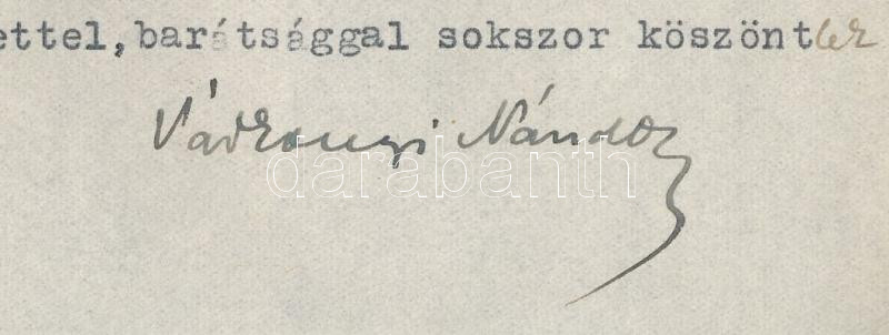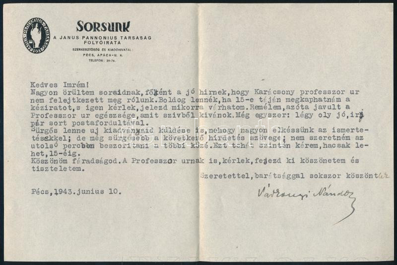 1943 Pécs, Várkonyi Nándor (1896-1975) író, irodalom- és kultúrtörténész, a Sorsunk c. folyóirat szerkesztőjének autográf aláírása gépelt levelén, a Sorsunk folyóirat fejléces levélpapírján