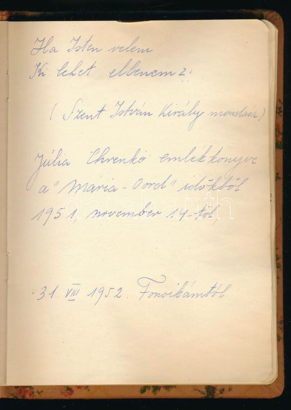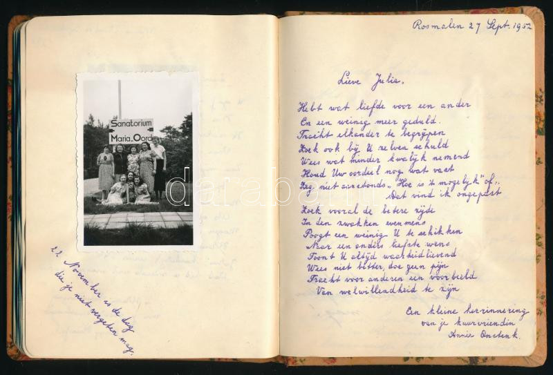 1952 Rosmalen (Hollandia), emlékkönyv holland nyelvű bejegyzésekkel, fotókkal, az első oldalon egy magyar nyelvű bejegyzéssel (Júlia Chrenkó emlékkönyve a "Mária-Oord" időkből)