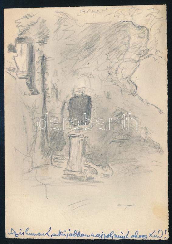 1962 Nemeskúti Rexa Dezső (1872-1964) irodalomtörténész, levéltáros, helytörténész, nyelvész, író autogárf levelezőlapja, saját rajzával Visegrád