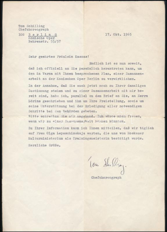 1965 Tom Schilling (1928- ) német táncművész, koreográfus, a berlini Komische Oper főkoreográfusának autográf aláírásával ellátott, gépelt levele Kaszás Ildikó (1941-2024) balett-táncos, koreográfus részére