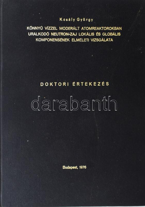 1976 Kosály György: Könnyű vízzel moderált atomreaktorokban uralkodó neutron-zaj lokális és globális komponensének elméleti vizsgálata. Doktori értekezés. Egészvászon-kötésben, kissé koszos borítóval, egyébként jó állapotban, (2)+106 p. Kosály György (Kosaly George) (Bp., 1933 - Seattle, USA, 2009) fizikus, egyetemi tanár, a fizikai tudományok doktori címét 1978-ban szerezte.