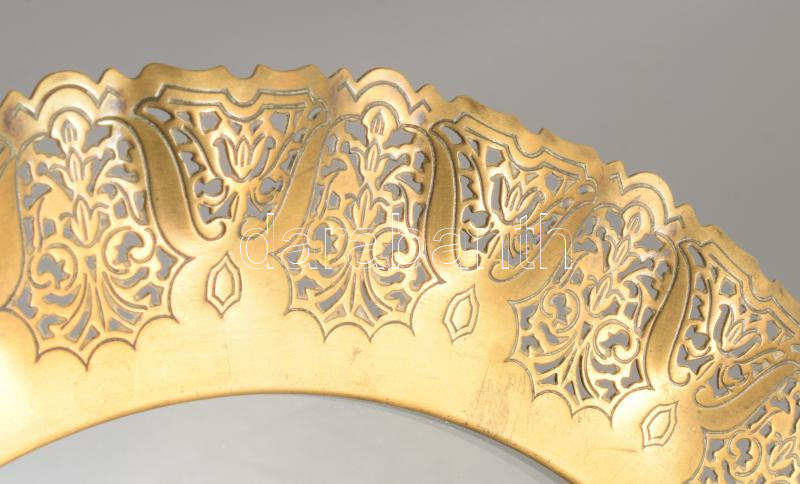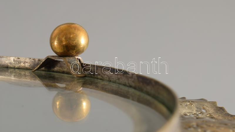 Antik áttört mintás réz szerelékes tálca csiszolt üvegbetéttel, három gömb lábon, "HUNNIA TENISZ VERSENY 1932 I. DÍJ" felirattal, d: 32,5 cm