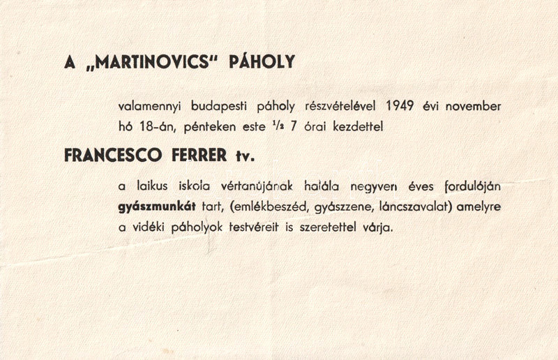 [Aprónyomtatvány] A budapesti Martinovics szabadkőműves páholy meghívója Francesco Ferrer (1859-1919) katalán szabadgondolkodó emléke alkalmából rendezett gyászmunkára. (1949).