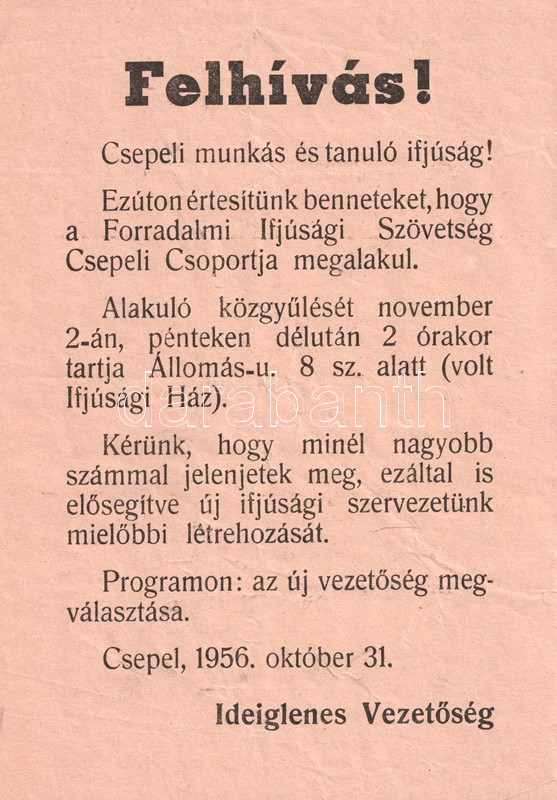 [Aprónyomtatvány, röplap, 1956.] A Forradalmi Ifjúsági Szövetség Csepeli Csoportja Ideiglenes Vezetőségének felhívása. (1956).