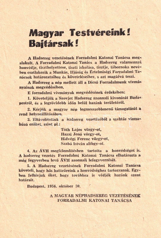 [Aprónyomtatvány, röplap, 1956.] Magyar Testvéreink! Bajtársak! A Magyar Néphadsereg Forradalmi Katonai Tanácsának ötpontos kiáltványa a Forradalmi Katonai Tanács megalakulása alkalmából. (1956).
