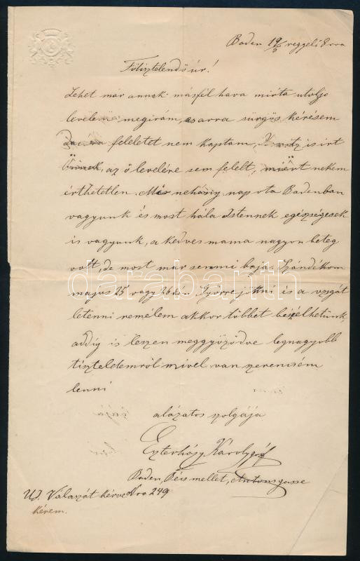 Baden bei Wien, gróf Eszterházy Károly saját kezű levele, "Főtisz...