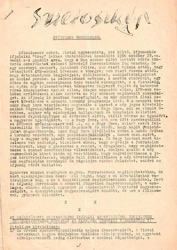 [Dokumentum, 1956.] Győzelmes forradalom. A Sztetoszkóp nevű egészségügyi lap sokszorosított, gépelt példánya a forradalom napjaiból, az Egészségügyi Minisztérium Ifjúsági Szervezetének Ideiglenes Intézőbizottságának követeléseivel. (1956).